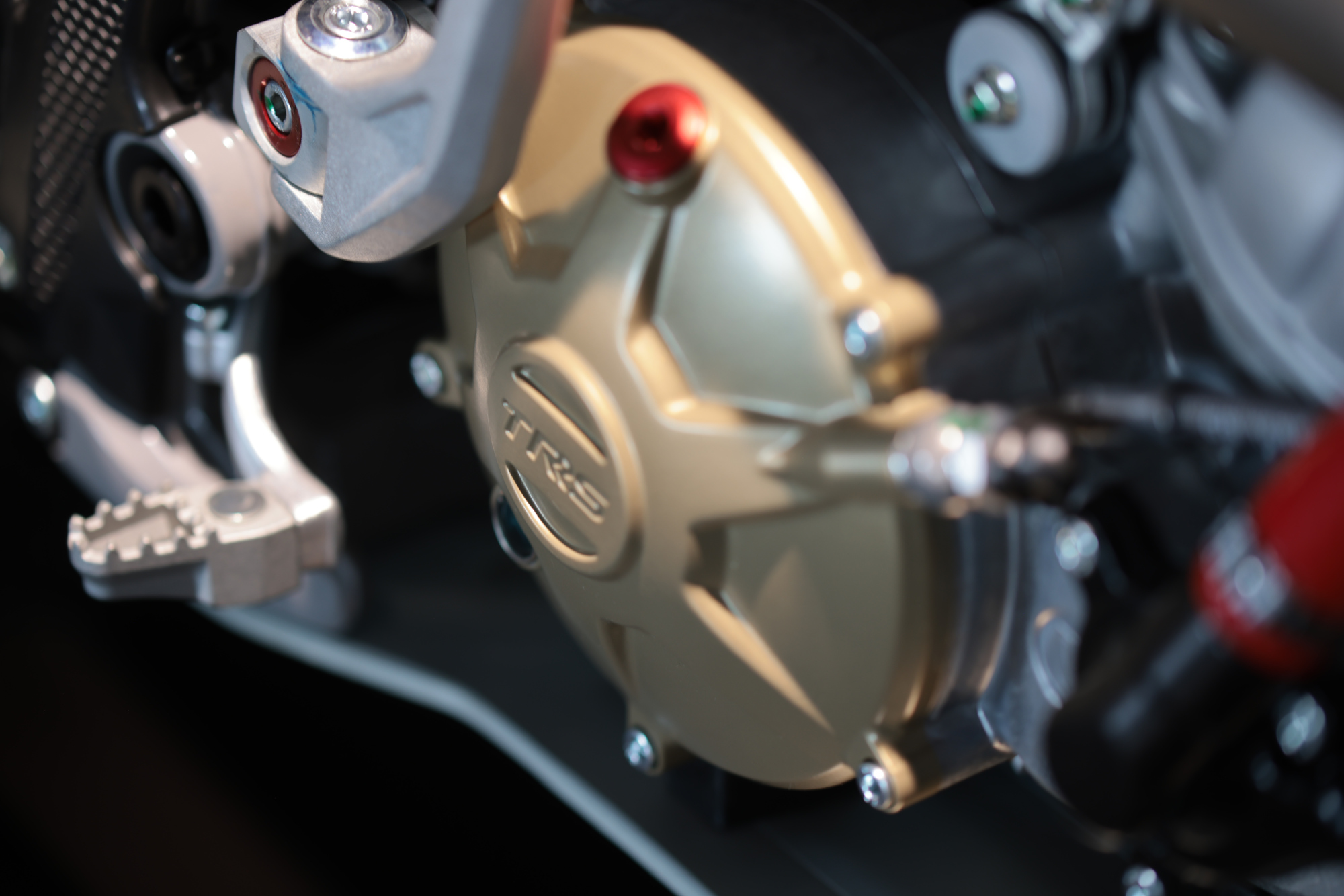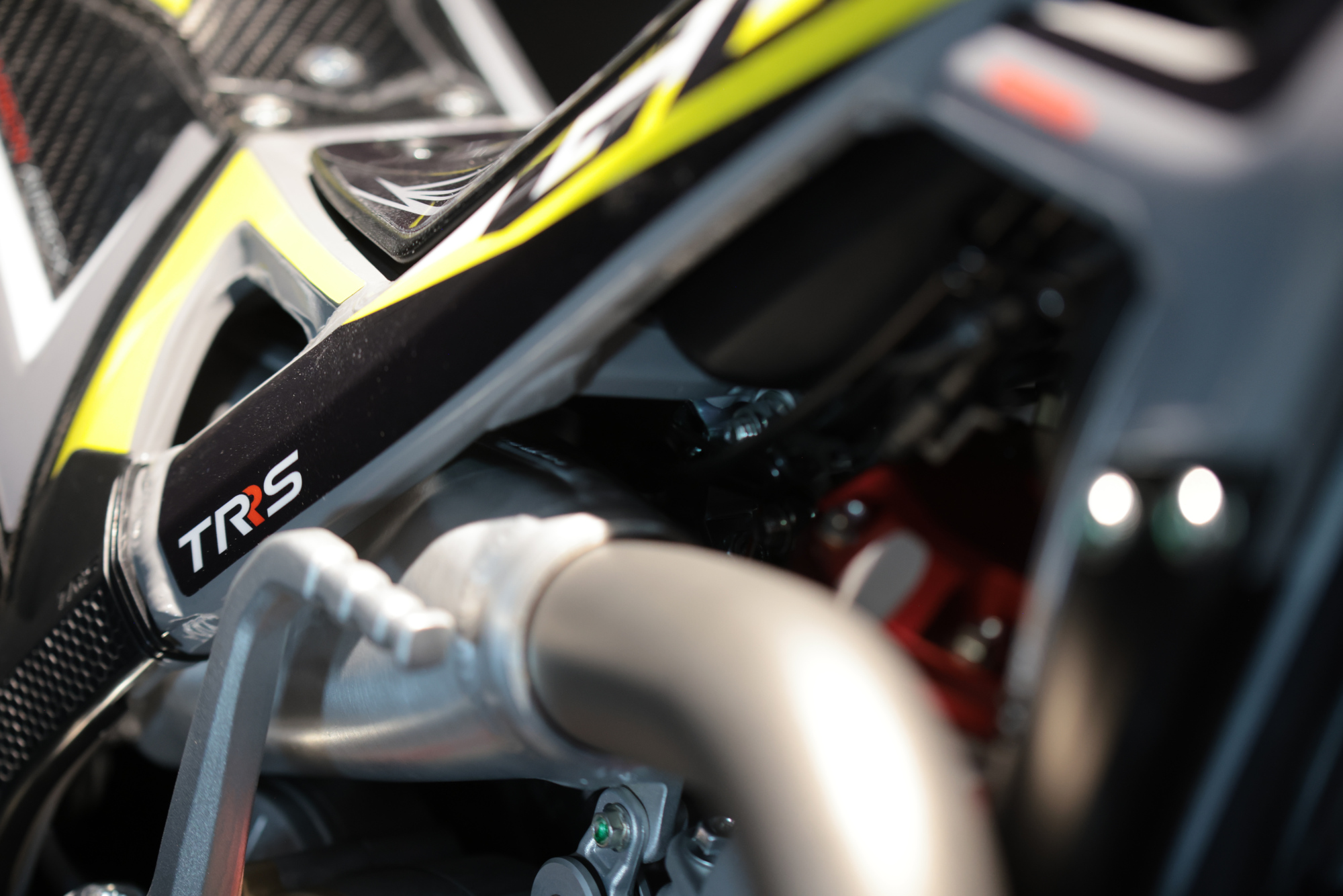 A work of engineering, technology and design in which carbon fibre is present in multiple components such as; the air filter box, the front mudguard bridge, as well as the silencer protector.